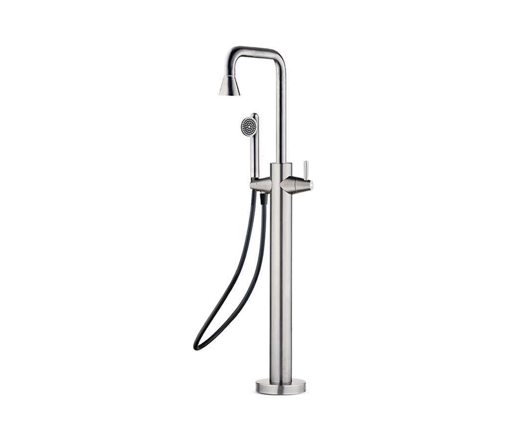 Freestanding bath mixer stainless steel with diverter cartridge and hand shower, brushed