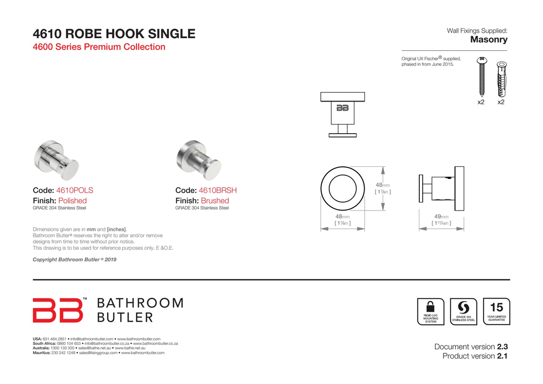 Description: Enhance your bathroom with the Bathroom Butler 4610 Robe Hook SINGLE -POLS, a premium accessory designed to add both function and style. Crafted from high-grade this Bathroom Accessory ensures durability and long-lasting performance.