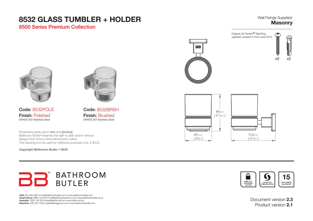 Description: Enhance your bathroom with the Bathroom Butler 8532 Glass Tumbler + Holder -BRSH, a premium accessory designed to add both function and style. Crafted from high-grade this Bathroom Accessory ensures durability and long-lasting performance.