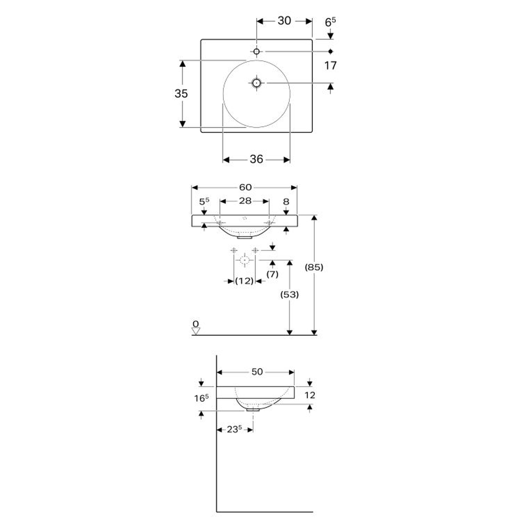 • Finish: 60x50cm, Tap hole=central, Overflow=visible, symmetrical, Shelf space=on both sides, white