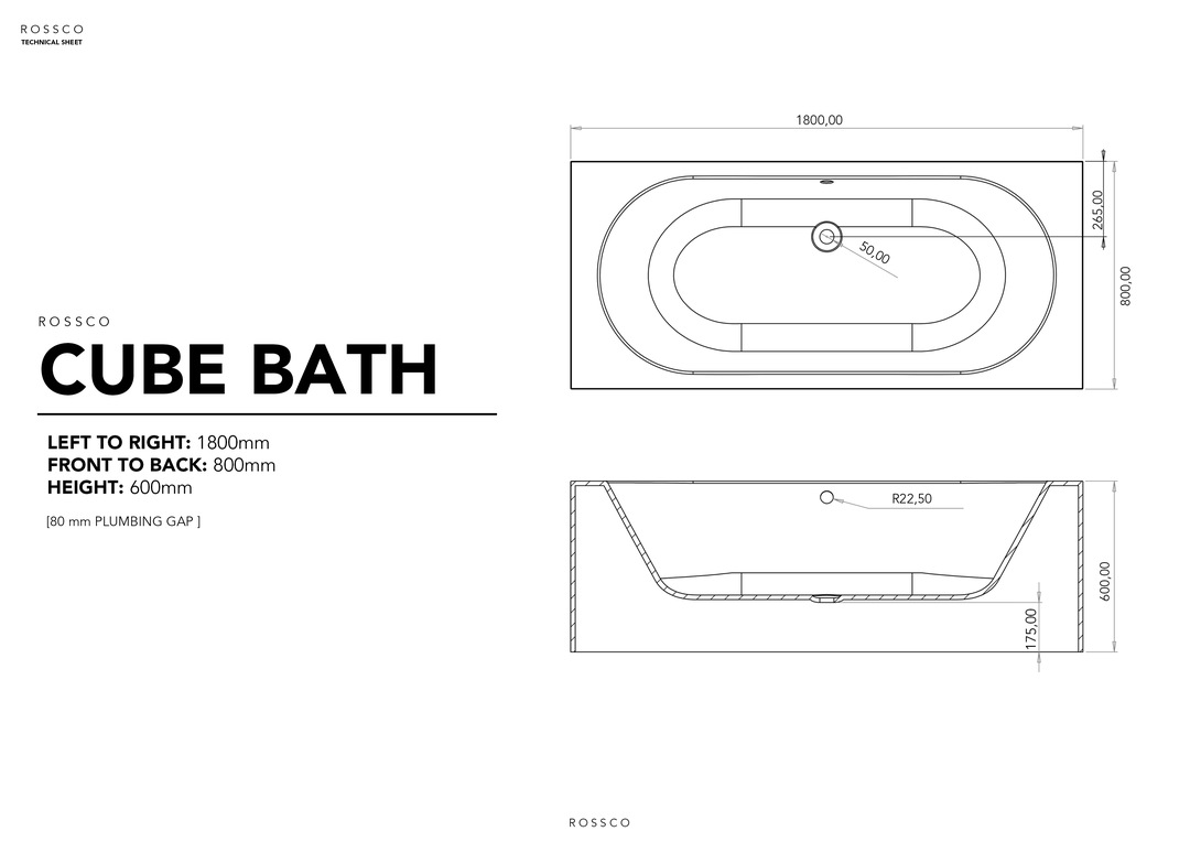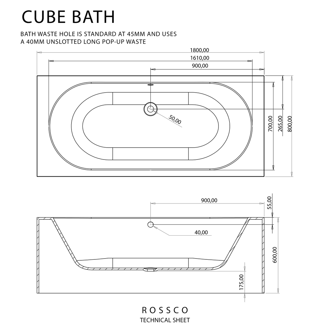 Description: The Rossco Cube Bath - 1800*800*600mm combines exceptional durability with a sleek design, perfect for residential and commercial spaces. Designed to withstand frequent use, this General Bathroom Product offers a stylish yet functional solution.