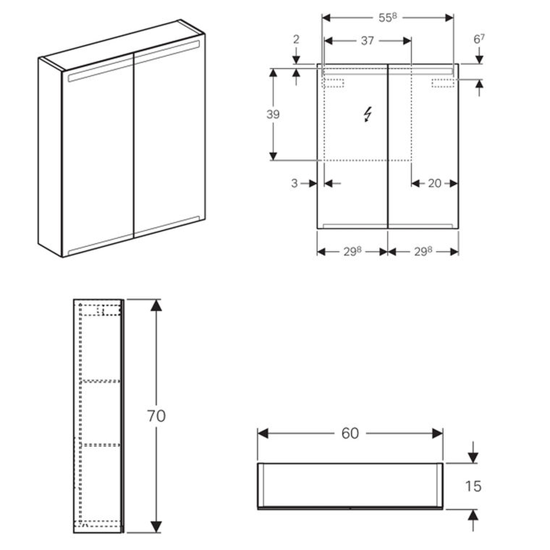 Description: The Geberit Geberit Option mirror cabinet with lighting and two doors: 60x70x15cm, Body: outside mirrored, Doors: inside and outside mirrored offers unmatched durability and precision for professional installations. Designed with compatibility in mind, it ensures smooth integration with other Geberit systems.