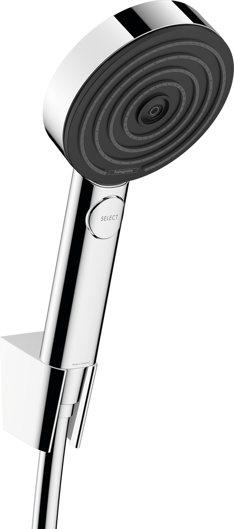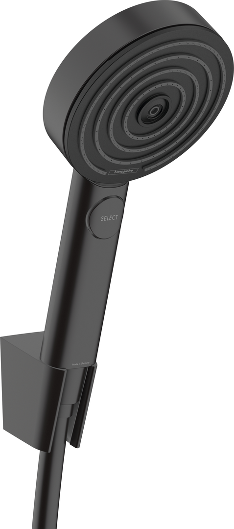 Description: Wellness package: Pulsify Select shower holder set with three types of jets - PowderRain included The Pulsify Select 105 Relaxation shower holder set in (3 jet types) with shower hose (1.60 m) from hansgrohe fulfills your desire for an innovative product for that daily feel-good shower. One look at the new type of spray disc in a rich shows: Pulsify clearly focuses people. The ring-shaped jet nozzles circle around the 105 mm shower head, reminiscent of gentle movements on water. The timeless round design and excellent workmanship in proven hansgrohe quality make Pulsify your ideal companion for any bathroom ambience. Switch jet types at the touch of a button (Select): hansgrohe PowderRain gently envelops the body like a cocoon, with the finest of water droplets. IntenseRain invigorates and is perfect for rinsing out shampoo. And the third jet type is a powerful massage spray. The set’s 1.60 m long shower hose allows plenty of room to move. Especially practical: the holder included in the set ensures that the shower head is always within reach. Clever details for long-lasting showering pleasure Thanks to the internal water supply, the ergonomic handle fits your hand comfortably, and doesn’t get hot, even during long showers. A rinseable filter screen catches dirt before it can enter the shower head. Additional features: • The expressive finish is easy to clean and retains its beauty, well, beautifully • Limescale can be easily wiped off the silicone nozzles on the shower head (QuickClean) • Easy installation: connects to any standard water outlet (size G ½; DN15) • After-sale guarantee: Spare parts can be purchased up to 15 years after the series has been discontinued - Hansgrohe - Pulsify Porter Sets - Shower - Hand Shower Set - Black