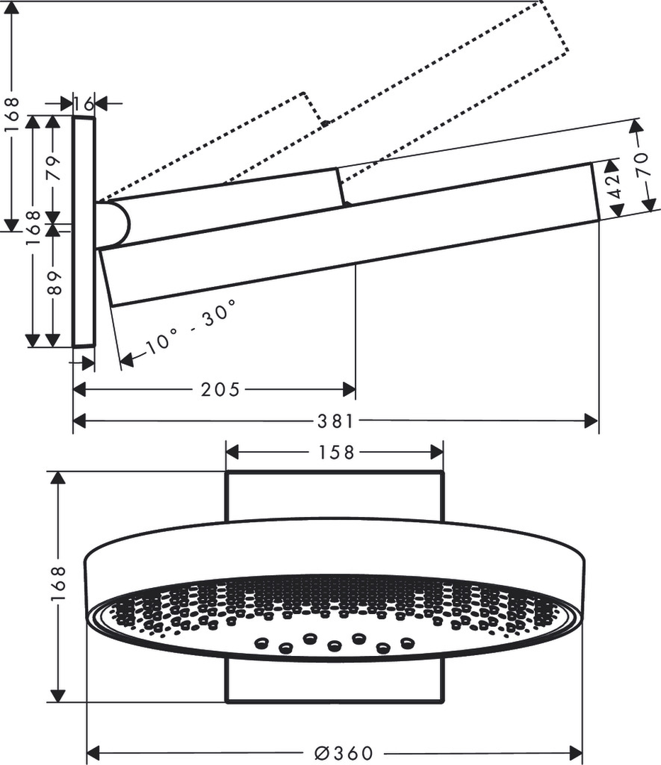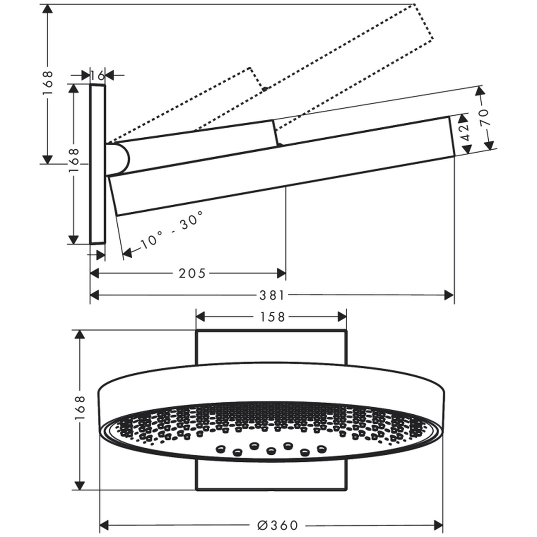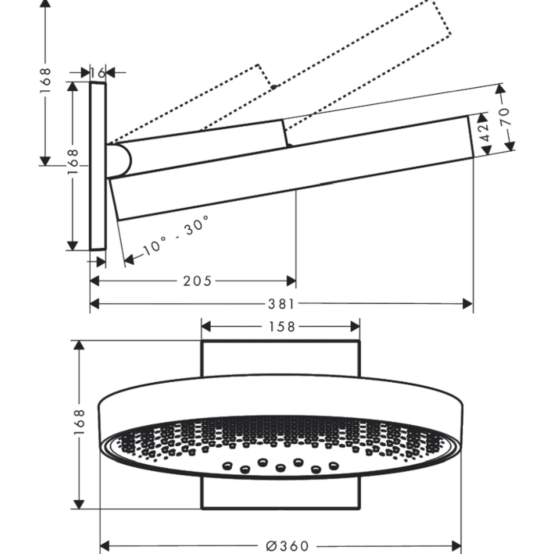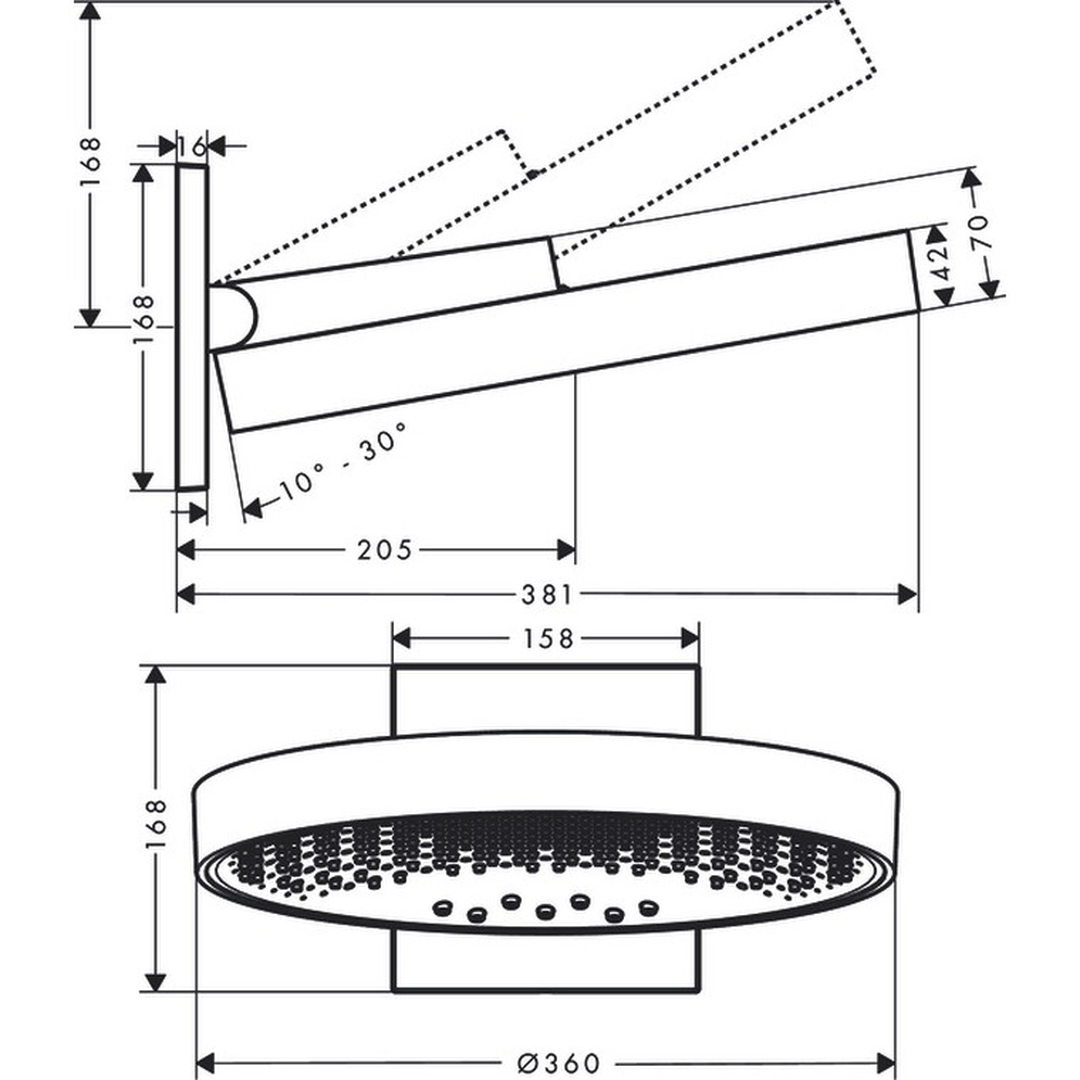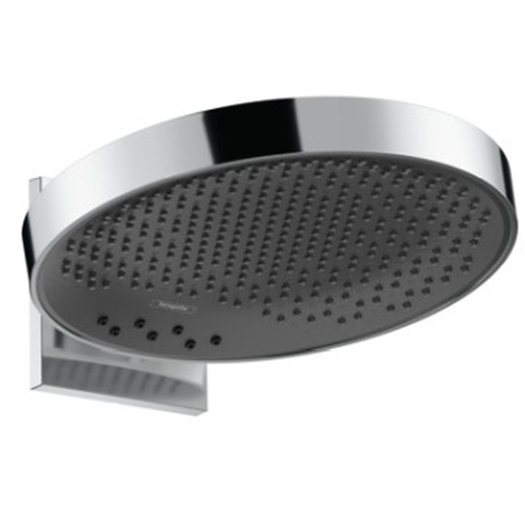 Description: Spa feeling with three jet types: design rain shower in modern colour scheme of and anthracite The hansgrohe Rainfinity 360 3jet rain shower with wall connection in is extra-large (360 mm diameter) and pampers users with three jet types: Intense PowderRain, an intense jet of micro-fine droplets for sensational showering; RainStream for soothing spa moments; and PowderRain for a cocoon of thousands of micro-fine droplets (3jet). The flow rate depends on the jet type – max. 20 l/min for PowderRain, max. 16 l/min for RainStream and max. 18 l/min for Intense PowderRain (at 3 bar). Hair can also stay dry if needed: be flexible in directing the water jet with the angle-adjustable shower head. On a visual level, the two-tone overhead shower with its metallic surface finish and the anthracite-colour anodised aluminium spray disc with its inwardly curved shape create a nice ambiance in the bathroom. Paired with other products from the Rainfinity range, design lovers can create their very own private feel-good bathroom. XXL showering indulgence with convenient cleaning options It is easy to remove limescale residues by lightly wiping the silicone nozzles on the shower head (QuickClean). The overhead shower can also be removed for cleaning when necessary. Extra convenience: The angle of the overhead shower can be adjusted vertically from 10-30° to keep hair dry if needed. • Installation on iBox: The overhead shower is fitted to the iBox universal base set from hansgrohe (#01800180) • Large-scale showering: 360 mm shower head for an even, luxurious water flow (XXL Performance) - Hansgrohe - Rainfinity - Showers - Shower Heads - Chrome