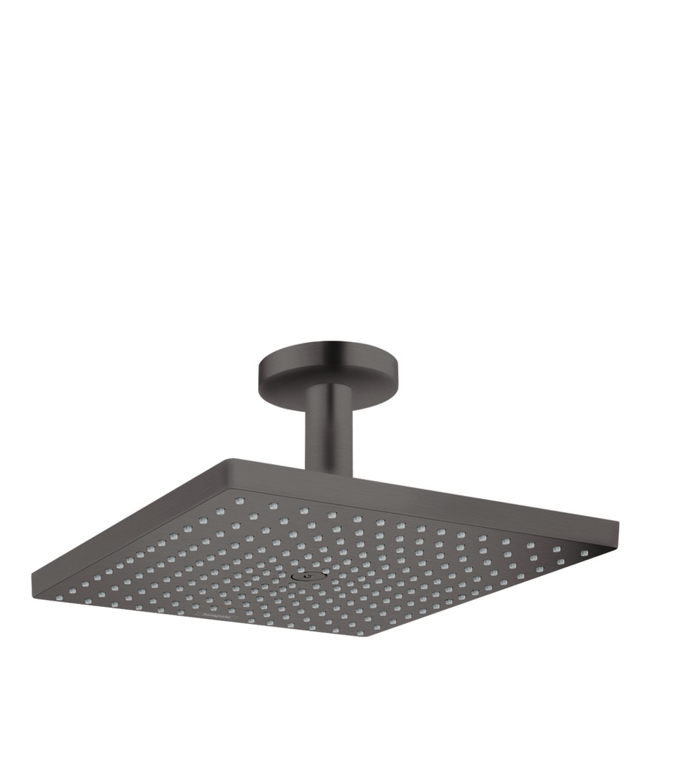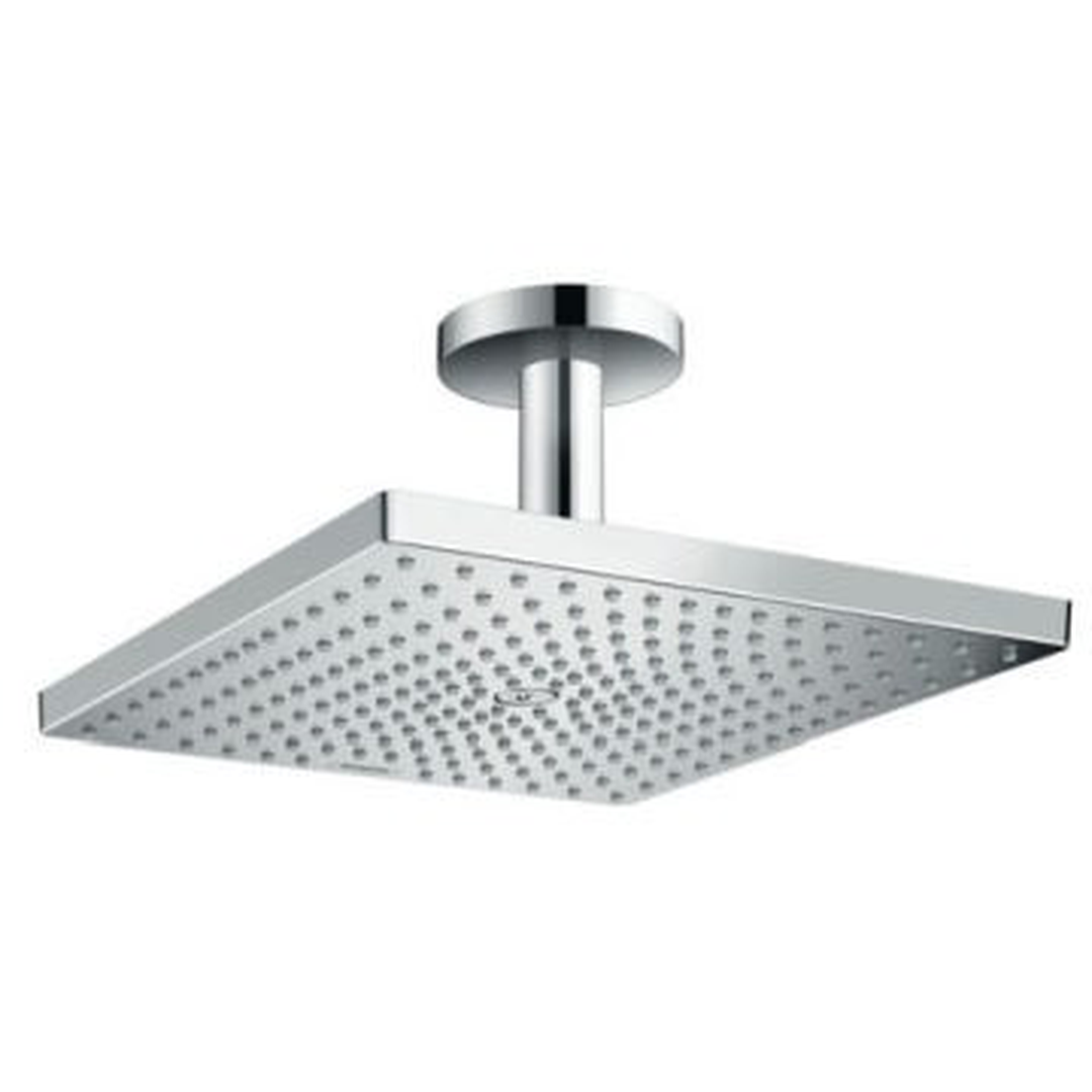 Description: Elegant design statement with the feel-good factor: large, square rain shower for ceiling mounting in The hansgrohe Raindance E 300 rain shower (1 jet type) with ceiling connector in for ceiling mounting boasts a modern and vivid design with the feel-good factor. The 300x300 mm overhead shower impresses users with its square shape and slimline silhouette, making it the perfect addition to modern bathroom design. With the high-quality shiny surface finish in the shower head becomes an elegant design statement. This shower’s RainAir jet type (1jet) with a maximum flow rate of 19 l/min (at 3 bar) envelops the body in velvety-soft water droplets. Yet another advantage: The shower head automatically adds air to the flowing water for water that feels fabulous (AirPower). Easy to clean, install and swivel the overhead shower Consistently stylish: The dishwasher-safe metal spray disc with its lasting quality surface finish can be simply taken off for easier cleaning. Limescale can also be removed by wiping the silicone nozzles on the shower head (QuickClean). The high-quality ball joint on the ceiling connector adds an extra level of convenience, as it can be used to swivel the angle of the overhead shower by up to 6 degrees. • Robust quality: The 100 mm long ceiling connector with lasting quality surface finish is made of metal and designed for long-term reliable functionality • Simple ceiling mounting: The overhead shower is fitted to a standard water connection via the 100 mm long shower arm (G ½ connection thread; size: DN15) • Large-scale showering: 300x300 mm shower head for an even, luxurious water flow (XXL Performance) - Hansgrohe - Raindance E - Showers - Shower Heads - Optic