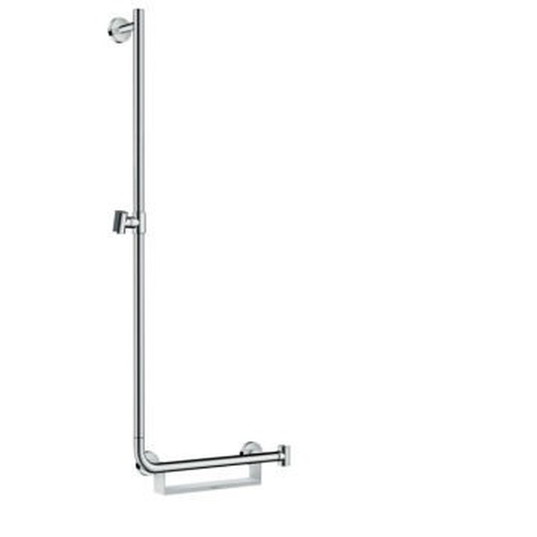 Description: Making a good thing even better: the shower rail with more convenience and safety The hansgrohe Unica Comfort 1.10 m shower rail, left in elegant chrome with a white shelf transforms every shower into a place of relaxation for your personal indulgence. The shower head can even be effortlessly moved to your preferred height and position. TÜV-tested grab bar But that’s not all! The 25 mm thick chrome-plated brass Unica shower rail with sturdy metal wall support can do so much more: It offers a TÜV-tested secure hold and withstands tensile forces of up to 200 kg, all while looking sleek and elegant. Sit while you shower for added comfort Anything is possible with the ingenious L-shape of the Unica Comfort shower rail: An additional shower support at hip height transforms sitting in the shower into a comfortable indulgence, while shower toiletries are always within reach on the practical shelf. The effort of stooping will be a thing of the past with this solution. Other features • Dazzling look: The long-lasting quality and permanent shine of the brilliant, easy-to-clean chrome finish impress time and time again • Suitable for any installation: mirror-inverted installation available (article no. 26404400) • The original: hansgrohe invented the shower rail and has continued developing it ever since • Guaranteed availability of spare parts up to 15 years after the range has been discontinued - Hansgrohe - Unica Comfort - Showers - Shower Accessories - White/Chrome