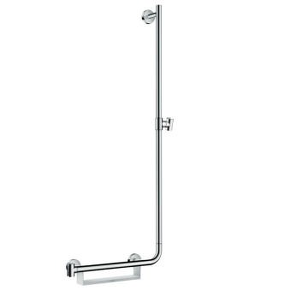 Description: Making a good thing even better: the shower rail with more convenience and safety The hansgrohe Unica Comfort 1.10 m shower rail, right in elegant chrome with a white shelf transforms every shower into a place of relaxation for your personal indulgence. The shower head can even be effortlessly moved to your preferred height and position. TÜV-tested grab bar But that’s not all! The 25 mm thick chrome-plated brass Unica shower rail with sturdy metal wall support can do so much more: It offers a TÜV-tested secure hold and withstands tensile forces of up to 200 kg, all while looking sleek and elegant. Sit while you shower for added comfort Anything is possible with the ingenious J-shape of the Unica Comfort shower rail: an additional shower support at hip height transforms sitting in the shower into a comfortable indulgence, while shower toiletries are always within reach on the practical shelf. The effort of stooping will be a thing of the past with this solution. Other features • Dazzling look: The long-lasting quality and permanent shine of the brilliant, easy-to-clean chrome finish impress time and time again • Suitable for any installation: mirror-inverted installation available (article no. 26403400) • The original: hansgrohe invented the shower rail and has continued developing it ever since • Guaranteed availability of spare parts up to 15 years after the range has been discontinued - Hansgrohe - Unica Comfort - Showers - Shower Accessories - White/Chrome
