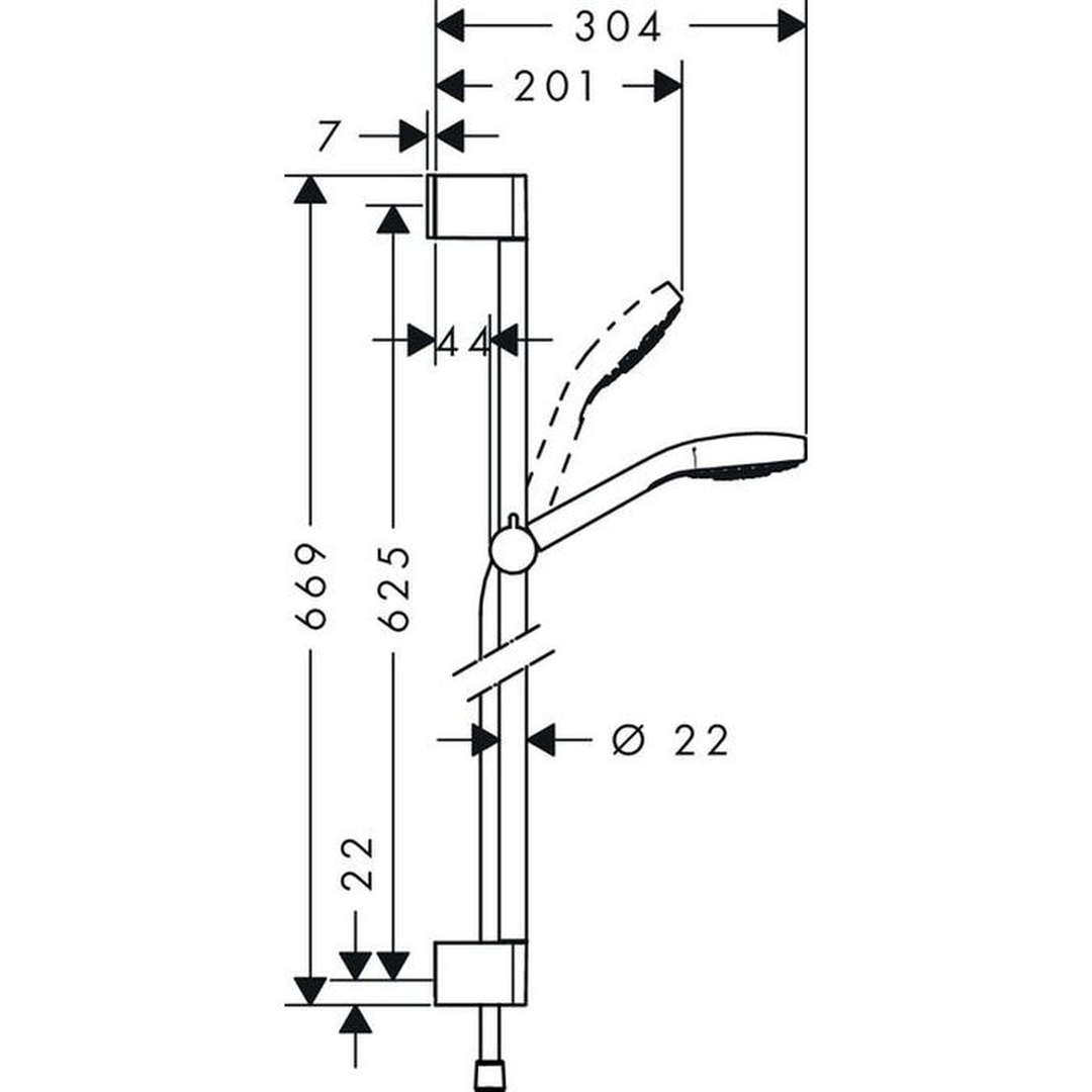 Description: Elegant & water-saving shower set with all mod cons The Croma Select E Vario 9l shower set pampers users with all modern comforts when showering, and the modern hand shower from hansgrohe even saves water. The flow is also fully automatically limited to a maximum of 9 l/min, even with high water pressure (EcoSmart). Users can simply switch between the three jet types for full comfort: at the touch of a button on the handle (Select). Alongside the hand shower, the complete set contains an original Unica shower rail and a 1.60 m long shower hose. The slide’s height can be adjusted on the shower rail (0.65 m) and the angle can be swivelled through 45°. A splash of variety in the shower Have a more varied and enjoyable shower with the coordinated jet types (3jet): Rain, IntenseRain and TurboRain. The Rain jet type offers the full shower rain experience - perfect for giving hair a thorough wash. The IntenseRain jet cascades onto the body to simply wash away the stress of daily life. The TurboRain jet for intense refreshment is best enjoyed with a full water flow. The timelessly elegant design blends in seamlessly with a modern bathroom setting. The white spray disc on the hand shower creates a fascinating contrast to the high-quality chrome finish. The internal water flow also prevents the ergonomic handle from heating up, no matter how long you shower. Other features • Easy to clean: Limescale can be removed by wiping the silicone nozzles on the shower head (QuickClean) • Great lengths for convenience: with the 1.60 m shower hose made of plastic in a metallic finish. A special mounting set prevents the shower hose from getting tangled • Many uses: The hand shower is suitable for continuous flow heaters • Quick to install: The shower hose can be screwed onto an existing standard connection in an instant (size: G 1/2) - Hansgrohe - Croma Select E - Showers - Shower Sets - White/Chrome