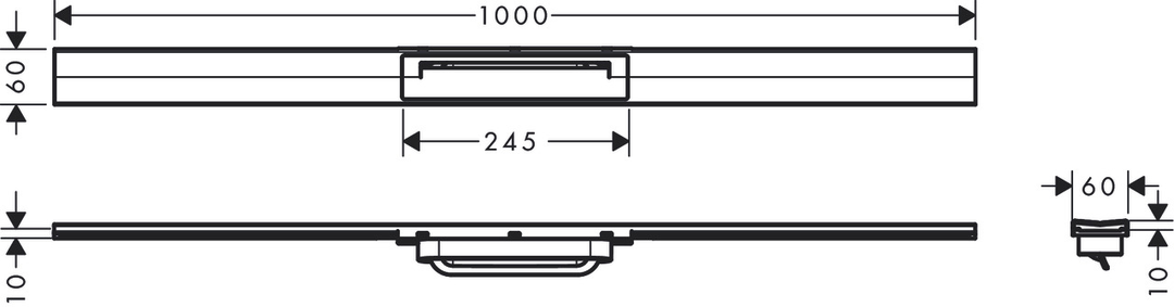 Description: Modern, can be shortened, powerful: hansgrohe RainDrain Flex drain barrier 100 cm in look with Dryphon and very high drainage performance The shortenable RainDrain Flex drain barrier 1000 (finish set) in look from hansgrohe is a high-quality, flexible drainage solution for modern showers. The rectangular cover in look completes the customised bathroom design – for a seamless design. The drain barrier can be shortened to the appropriate dimensions on site. This simplifies flush-mounted installation on both sides in different shower areas. The RainDrain Flex drain barrier can also be height adjusted via an integrated adapter – for floor-level installation minus the tripping hazard. The result meets the requirements of a barrier-free shower area. When using the hansgrohe Dryphon drainage system that is included in the scope of delivery, the drain barrier offers a revolutionary drainage capacity of up to 60 L/min. This makes RainDrain Flex your ideal partner for even the largest of hansgrohe showers. The high drainage rate combined with the innovative high-tech silicone membrane also ensure that hair and dirt do not get stuck. This helps prevent annoying blockages in the drain. Optionally, a standard trap can be used. Simple. Nice. The Dryphon insert can be removed from the basic set for thorough, easy cleaning. Uncomplicated: They are installed on a basic set with pre-assembled sealing fleece (sold separately). Other special features • Easy installation directly on the screed thanks to integrated gradient • Suitable for primary drainage • Required base set depending on application area: Seal water height 30 mm: #01000180 or seal water height 50 mm: #01001180 • Easy-care, durable finish in - Hansgrohe - Raindrain - Floor Drain - Shower Channel - Optic
