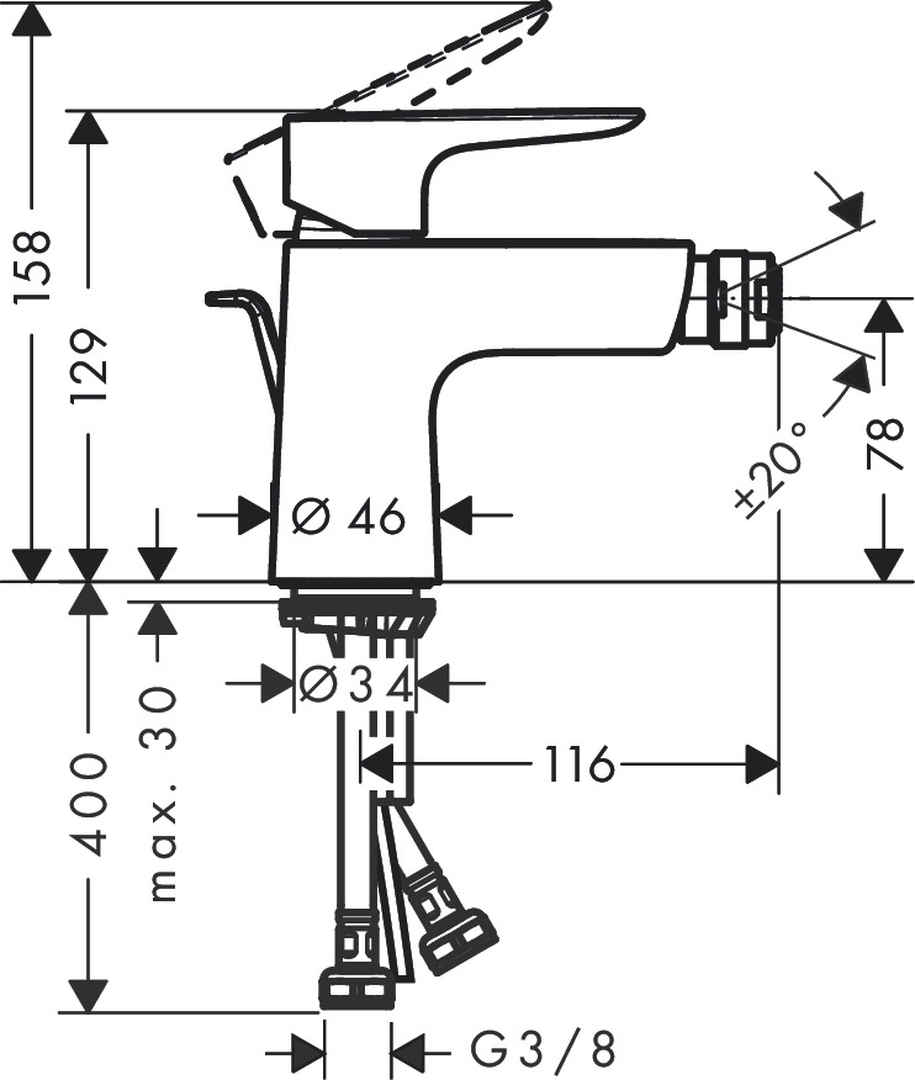 Description: When comfort meets design: single lever bidet tap with metallic surface finish The Talis E single lever bidet tap with pop-up waste set in from hansgrohe has found a captivating way to combine comfort and design. As is standard for all Talis E models, the opulent, gravity-defying surfaces, precision edges and gently tapered shapes are the signature elements of this bidet tap’s design. With its metallic surface finish, the tap for bidets is the perfect addition to modern bathroom designs. The bidet tap features a ball joint jet former that can be set at 20 degrees in any direction. So the water jet can be tailored to suit the user’s requirements and adapted to personal preferences. Reliable to operate, easy to use and effortless to clean The water volume and temperature can be quickly and easily set using the flat lever handle. The user-friendly ceramic mixer system guarantees long-lasting, reliable functionality. • Noticeably voluminous, softer droplets: The water is automatically enriched with air (AirPower) • Easy to clean: Effortlessly remove limescale by lightly wiping the silicone insert on the spout (QuickClean) • Convenient operation: The pop-up waste set can be opened and closed in one hand movement • Easy installation: The tap is attached via flexible connection hoses (G ?) to the water connections (size: DN15) • Many uses: Suitable for continuous flow heaters • Guaranteed availability: Spare parts can be purchased up to 15 years after the range has been discontinued - Hansgrohe - Talis E - Taps - Bidet Mixers - Chrome