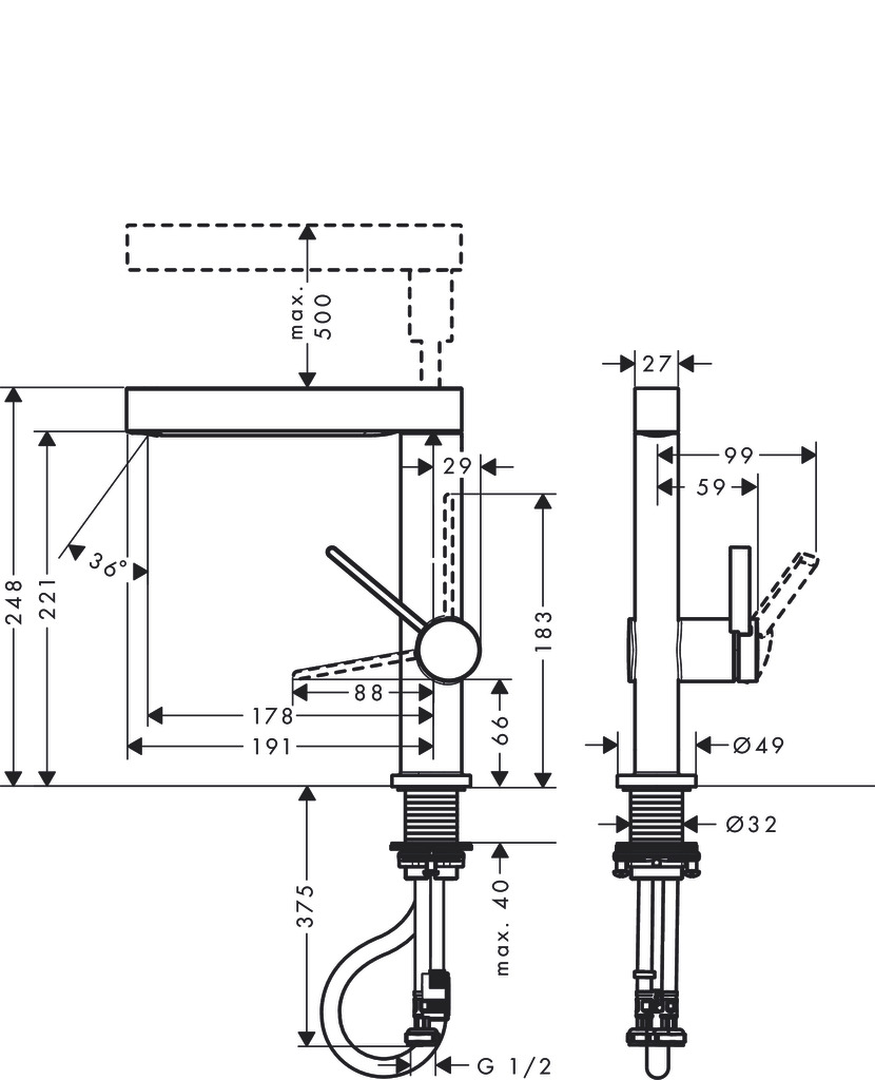 Description: Flexible design tap with pull-out spray The Finoris 230 single lever basin mixer with pull-out spray from hansgrohe makes an inspiring statement with its sleek, geometric design and numerous convenient functions. The hand basin is the heart of the bathroom. Here, life is often turbulent and there always seem to be new challenges. Nice to have a real team player as your hand basin partner to support you with revolutionary ideas. For example, the spout can be flexibly pulled out to a length of up to 0.50 meters. The Select button from hansgrohe switches from the crystal-clear laminar spray to the PowderRain jet type, at the touch of a button. This helps with quick hair washing under the tap, baby baths, rinsing out the hand basin, and much more. - Hansgrohe - Finoris - Mixer - Basin mixer - Chrome