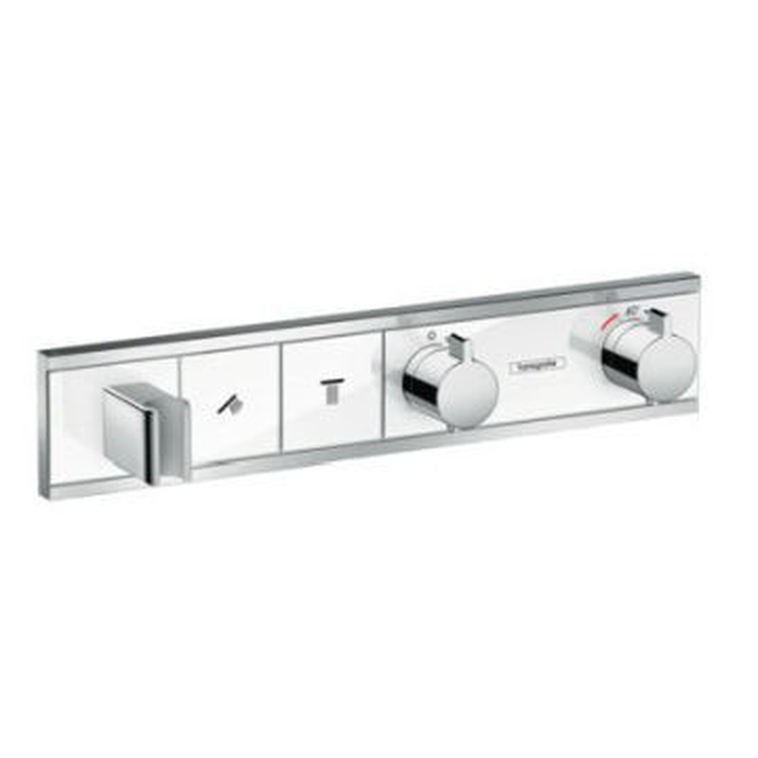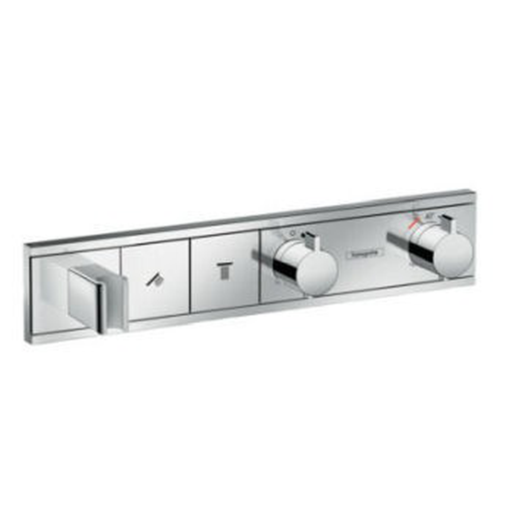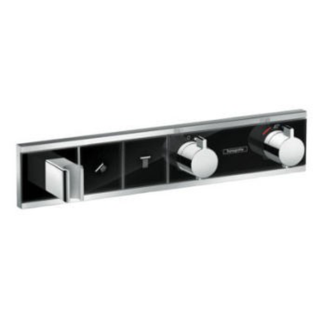 Description: For the highest standards: design thermostatic shower mixer with all mod cons Spreading joy through an abundance of elegance: The RainSelect concealed installation thermostatic mixer for 2 functions is seamlessly integrated into the wall. Users are impressed by how easy it is to use, with large buttons featuring clear, wear-resistant symbols that can be used to turn the overhead and hand shower on and off (Select). All showers can also be used at the same time. The water temperature and volume are set via handy control dials. More convenience for longer The high-quality, lavishly chrome-plated metal surface is long-lasting and easy to clean. The dials and Select function use a tried-and-tested mechanical control from hansgrohe – for ongoing and reliable functionality. A practical shut-off function helps to stop water flowing unexpectedly when pressure is placed on the Select push buttons during cleaning. Also convenient: The built-in holder for the shower head, which keeps the hand shower within reach at all times. Safe in the knowledge of an indulgent shower The hansgrohe thermostatic shower mixer keeps the set water temperature constant, even with sudden pressure fluctuations. This protects users from excessively hot or cold water. An extra safety lock only releases hot water once a button is pressed (SafetyStop). A maximum temperature can also be set during installation, and the reliable thermostatic mixer will not exceed it. More space in the shower The elegant (concealed) installation of the tap technology in the wall gives the hansgrohe RainSelect thermostatic shower mixer so much space for care-free showering. The waterproof and sound insulated base set for 2 consumers (article no. 15310180) is required for installation. Sold separately. - Hansgrohe - Ecostat - Taps - Thermostatic Mixers - Chrome