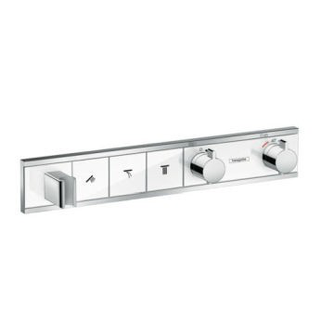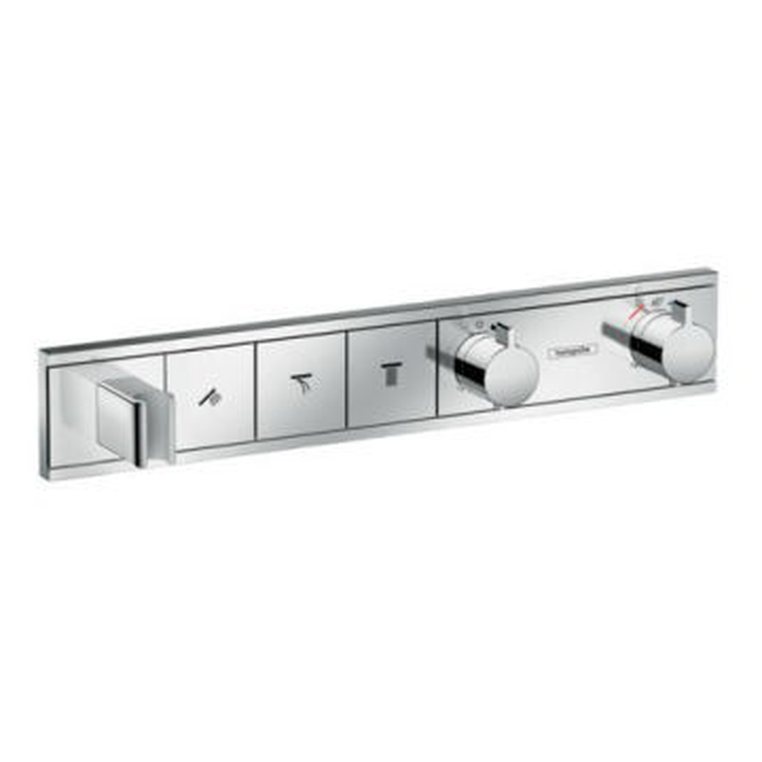 Description: For the highest standards: design thermostatic shower mixer with all mod cons Spreading joy through an abundance of elegance: The RainSelect concealed installation thermostatic mixer for 3 functions is seamlessly integrated into the wall. Users are impressed by how easy it is to use, with large buttons featuring clear, wear-resistant symbols that can be used to turn the hand shower and overhead shower with two jet types on and off (Select). All showers can also be used at the same time. The water temperature and volume are set via handy control dials. More convenience for longer The high-quality, lavishly chrome-plated metal surface is long-lasting and easy to clean. The dials and Select function use a tried-and-tested mechanical control from hansgrohe – for ongoing and reliable functionality. A practical shut-off function helps to stop water flowing unexpectedly when pressure is placed on the Select push buttons during cleaning. Also convenient: The built-in holder for the shower head, which keeps the hand shower within reach at all times. Safe in the knowledge of an indulgent shower The hansgrohe thermostatic shower mixer keeps the set water temperature constant, even with sudden pressure fluctuations. This protects users from excessively hot or cold water. An extra safety lock only releases hot water once a button is pressed (SafetyStop). A maximum temperature can also be set during installation, and the reliable thermostatic mixer will not exceed it. More space in the shower The elegant (concealed) installation of the tap technology in the wall gives the hansgrohe RainSelect thermostatic shower mixer so much space for care-free showering. The waterproof and sound insulated base set for 3 consumers (article no. 15311180) is required for installation. Sold separately. - Hansgrohe - RainSelect - Taps - Thermostatic Mixers - Chrome