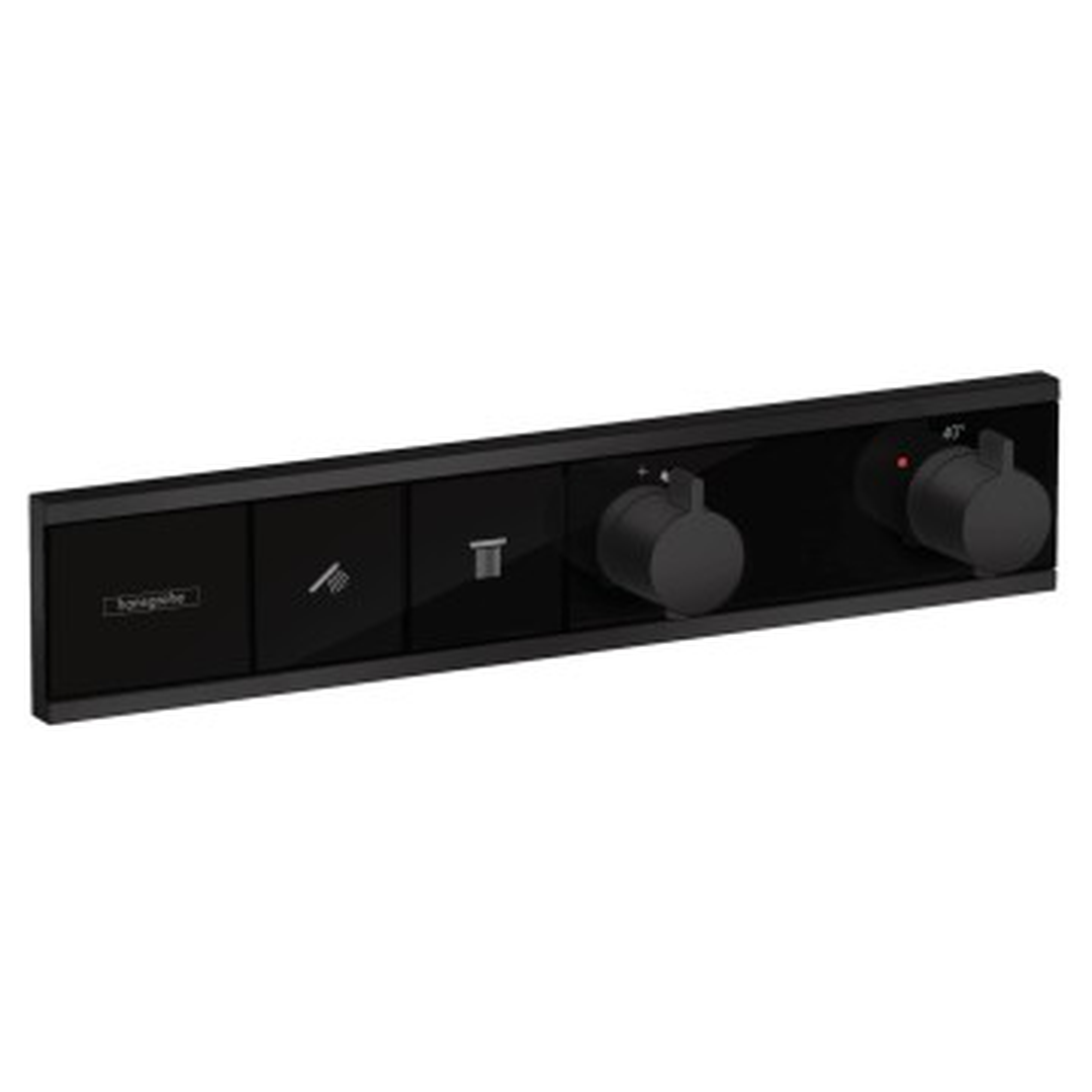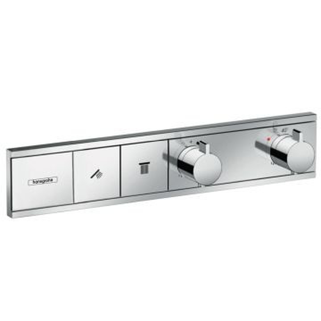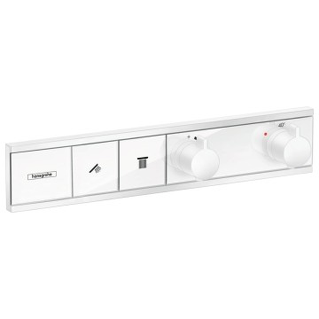Description: A user-friendly nugget of the hansgrohe RainSelect thermostatic shower mixer with designer flair in The hansgrohe RainSelect concealed installation thermostatic mixer for two functions in is an innovative shower control that wows with the perfect balance of shape, functionality and colour. The design features a slimline silhouette, elegant style and high-quality materials. The long-lasting shiny surface finish in adds a sense of luxury to the thermostatic mixer, which is designed to add structure to the space. The two functions, e.g. hand and overhead shower, are simply controlled at the touch of the large, clearly labelled operating buttons (Select). The water volume and temperature are quick and easy to set using the two ergonomic control dials. Benefit of concealed installation: The technology vanishes in the wall, making way for design, practical functions and more space in the shower. The RainSelect base set for two functions (#15310180) is required for installation. Innovative functions for an extra level of comfort, convenience and safety Intuitive and long-lasting: Similar to a light switch, the water sources can be switched on and off using 70x70 mm mechanical buttons. The water volume and temperature can be regulated using the ergonomic control dials, even with soapy hands. Easy to clean: The water flow can be easily stopped by swiping the Select push buttons (shut-off function). • For added convenience, the thermostatic mixer keeps the water at the set temperature and offers reliable protection against excessively hot or cold water • A button on the handle only releases hot water exceeding 40° C when needed and prevents any unwanted adjustments to the water temperature (SafetyStop) • Ultra-safe: An adjustable temperature limitation feature protects against scalding water - Hansgrohe - RainSelect - Taps - Thermostatic Mixers - Optic