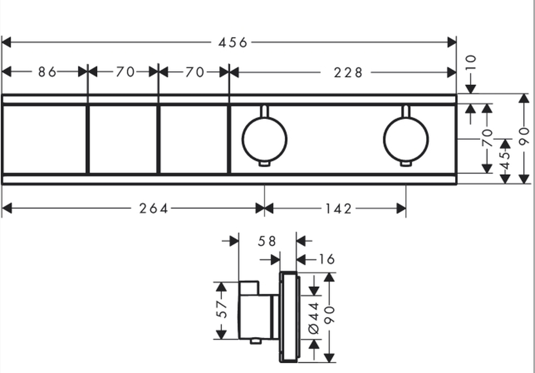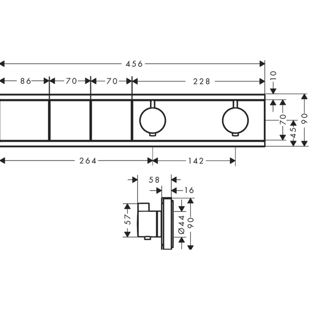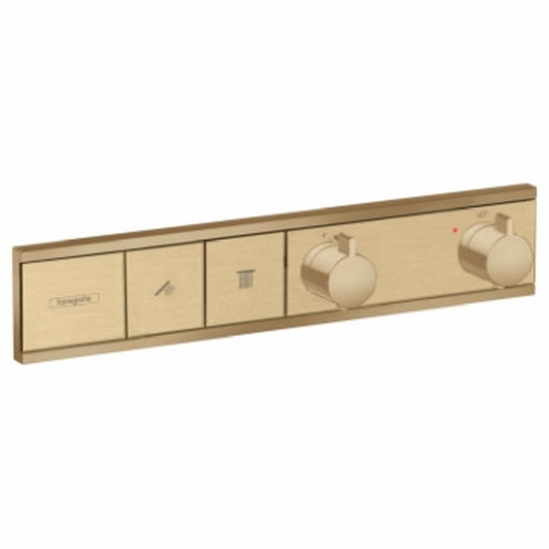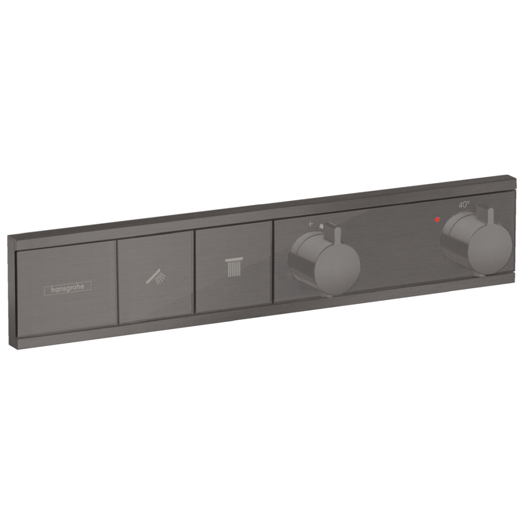 Description: A user-friendly nugget of the hansgrohe RainSelect thermostatic shower mixer with designer flair in The hansgrohe RainSelect concealed installation thermostatic mixer for two functions in is an innovative shower control that wows with the perfect balance of shape, functionality and colour. The design features a slimline silhouette, elegant style and high-quality materials. The long-lasting shiny surface finish in adds a sense of luxury to the thermostatic mixer, which is designed to add structure to the space. The two functions, e.g. hand and overhead shower, are simply controlled at the touch of the large, clearly labelled operating buttons (Select). The water volume and temperature are quick and easy to set using the two ergonomic control dials. Benefit of concealed installation: The technology vanishes in the wall, making way for design, practical functions and more space in the shower. The RainSelect base set for two functions (#15310180) is required for installation. Innovative functions for an extra level of comfort, convenience and safety Intuitive and long-lasting: Similar to a light switch, the water sources can be switched on and off using 70x70 mm mechanical buttons. The water volume and temperature can be regulated using the ergonomic control dials, even with soapy hands. Easy to clean: The water flow can be easily stopped by swiping the Select push buttons (shut-off function). • For added convenience, the thermostatic mixer keeps the water at the set temperature and offers reliable protection against excessively hot or cold water • A button on the handle only releases hot water exceeding 40° C when needed and prevents any unwanted adjustments to the water temperature (SafetyStop) • Ultra-safe: An adjustable temperature limitation feature protects against scalding water - Hansgrohe - RainSelect - Taps - Thermostatic Mixers - Optic