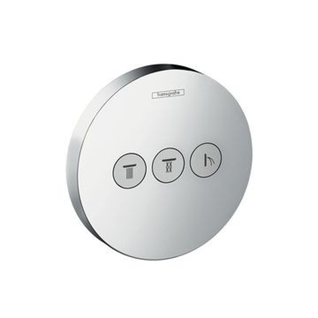 Description: When fitting the hansgrohe ShowerSelect valve for three functions, the shower control is completely hidden in the wall, that is "under the plaster". (The installation is based on the hansgrohe iBox universal basic set for concealed installation.) The specialist fits the round chrome set with the three Select buttons to the elegantly concealed technology. When showering, the overhead and hand showers and their spray types can simply be selected by the touch of a button – control pleasure at its purest! - Hansgrohe - ShowerSelect S - Taps - Shut-Off Valves - Chrome