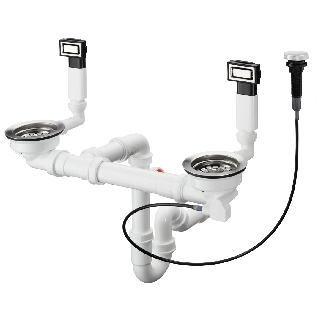 Description: Fitting waste and overflow set for stainless steel kitchen sinks with double basins from hansgrohe The D15-11 automatic waste and overflow set for double basins fits all stainless steel sinks from hansgrohe featuring two sink basins. Different basin widths are no longer a problem with a flexible installation pipe. This makes the choice just as easy as the installation. The stainless steel strainer in the main basin can be conveniently opened and closed by twisting the eccentric remote control on the sink rim. A second tap hole is required for the knob. In the additional basin, the drain can be operated by simply pulling or pushing the strainer. The rectangular overflow features a subtle design with a chrome-plated metal cover near the top of the basin. This creates an elegant look at the sink and is effective in stopping water from overflowing. The D15-11 from hansgrohe is stylish and safe in equal measure. Other features • Compact design: The waste system features a space-saving connector bend for more space under the sink • Consists of: automatic waste and overflow set, eccentric drain valve, bottle trap • Screen valve with 3 ½ inch diameter • Versatile: includes optional connection for a drain pipe (e.g. for the dishwasher) - Hansgrohe - - Wastes, Traps & Overflows - Sink Wastes - Stainless Steel