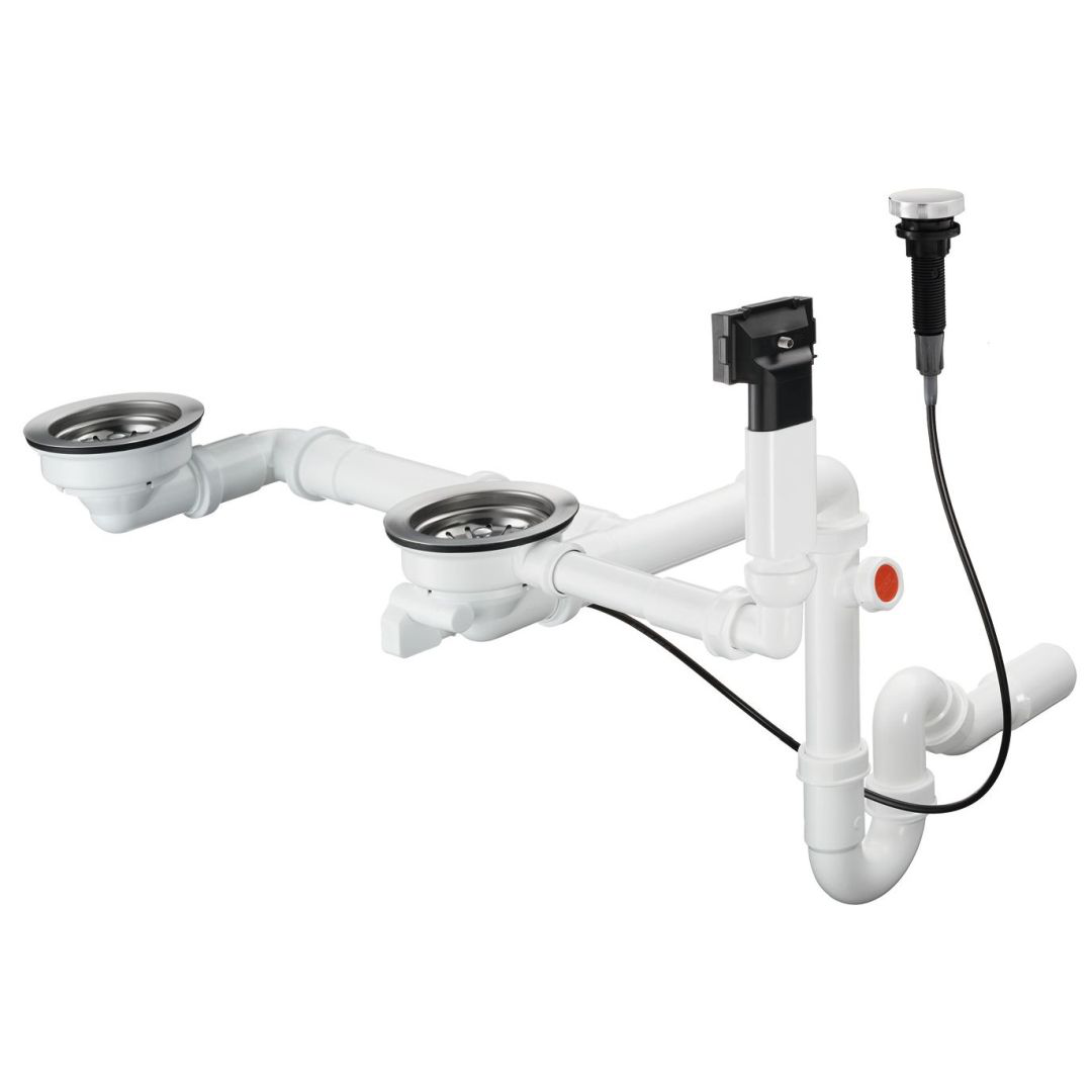 Description: Fitting waste and overflow set for granite kitchen sinks with double basins from hansgrohe The D17-11 automatic waste and overflow set for double basins fits all granite sinks (SilicaTec) from hansgrohe featuring two sink basins. Different basin widths are no longer a problem with a flexible installation pipe. This makes the choice just as easy as the installation. The high-quality chrome-plated metal strainer in the main basin can be conveniently opened and closed by twisting the eccentric remote control on the sink rim. A second tap hole is required for the knob. In the additional basin, the drain can be operated by simply pulling or pushing the strainer. The rectangular overflow features a subtle design with a chrome-plated metal cover near the top of the basin. This creates an elegant look at the sink and is effective in stopping water from overflowing. The D17-11 from hansgrohe is stylish and safe in equal measure. Other features • Compact design: The waste system features a space-saving connector bend for more space under the sink • Consists of: automatic waste and overflow set, eccentric drain valve, bottle trap • Screen valve with 3 ½ inch diameter • Versatile: includes optional connection for a drain pipe (e.g. for the dishwasher) - Hansgrohe - - Wastes, Traps & Overflows - Waste & Overflow Kits - Chrome