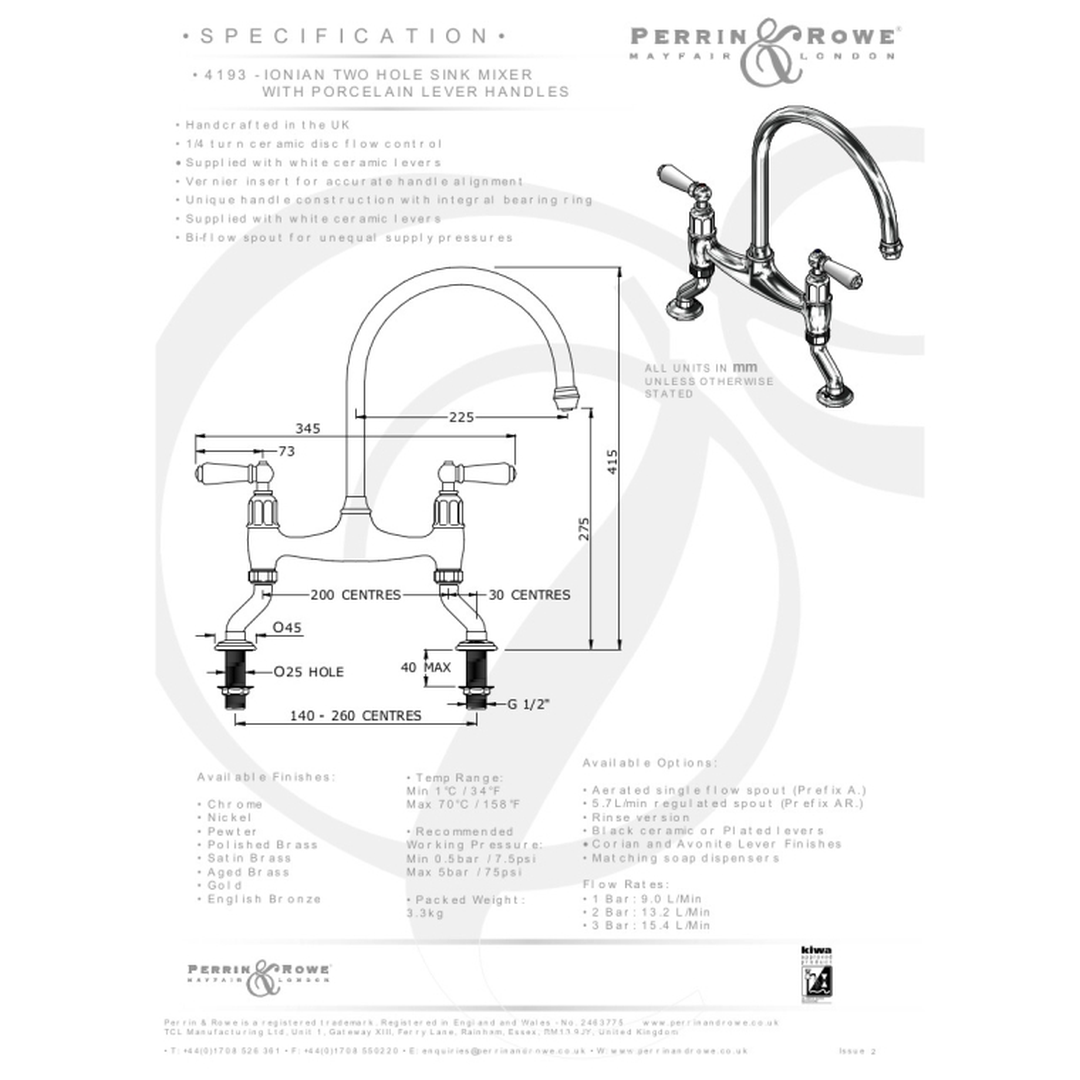 Description: The House of Rohl P&R Ionian Bridge Mixer with Lever Handles offers a seamless blend of functionality and elegant design, making it an ideal addition to any modern bathroom. Crafted from Brass, it ensures both durability and beauty.