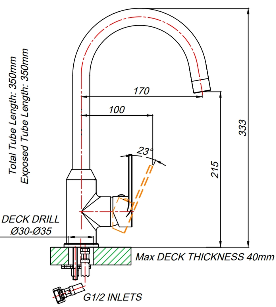 Description: Upgrade your kitchen with the Blutide The Bay Range Single Hole Sink Mixer, designed for both style and functionality. This sink mixer features a sleek swivel spout and a generous reach of 170mm, making it a practical addition to any kitchen setup. Key Features: Brand: Blutide Model: The Bay Range Type: Single Hole Sink Mixer Spout: Swivel Reach: 170mm Inlet Tubes: 2x ½" braided, 350mm in length Installation: Requires a drill hole diameter of 30-35mm The Blutide The Bay Range Sink Mixer boasts a modern design with a swivel spout that enhances your kitchen's functionality by providing flexibility in water direction. Its single hole installation simplifies the setup process, while the included braided inlet tubes ensure a hassle-free installation. This sink mixer is perfect for those seeking a blend of contemporary design and practical features. The recommended drill hole diameter for installation is between 30-35mm, allowing for a seamless fit into your kitchen countertop. - Bay One Hole Sink Mixer Chrome